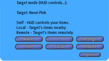 Remote - Put the HUD into remote control mode. The HUD will affect items worn by your targeted partner who is anywhere in SecondLife.